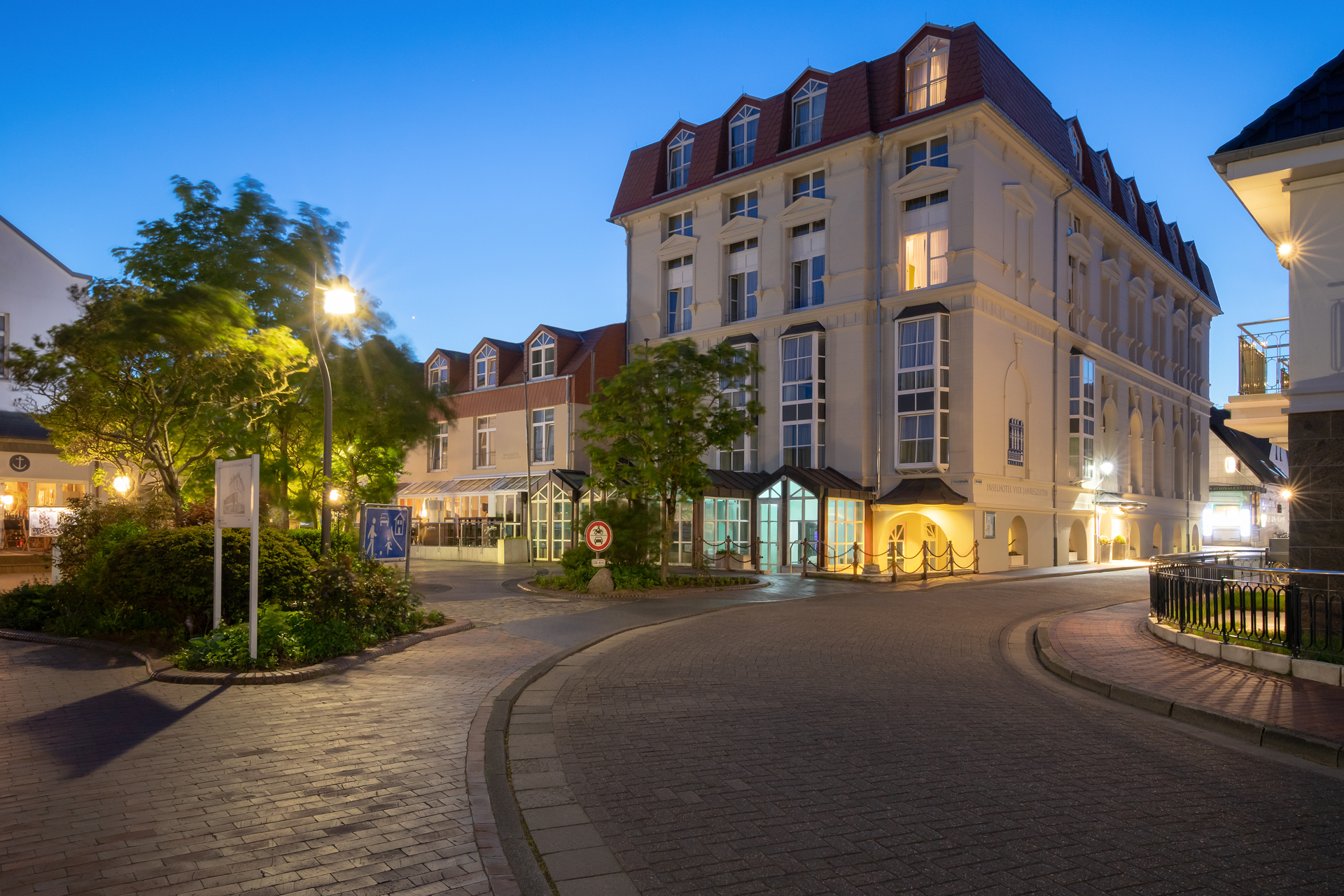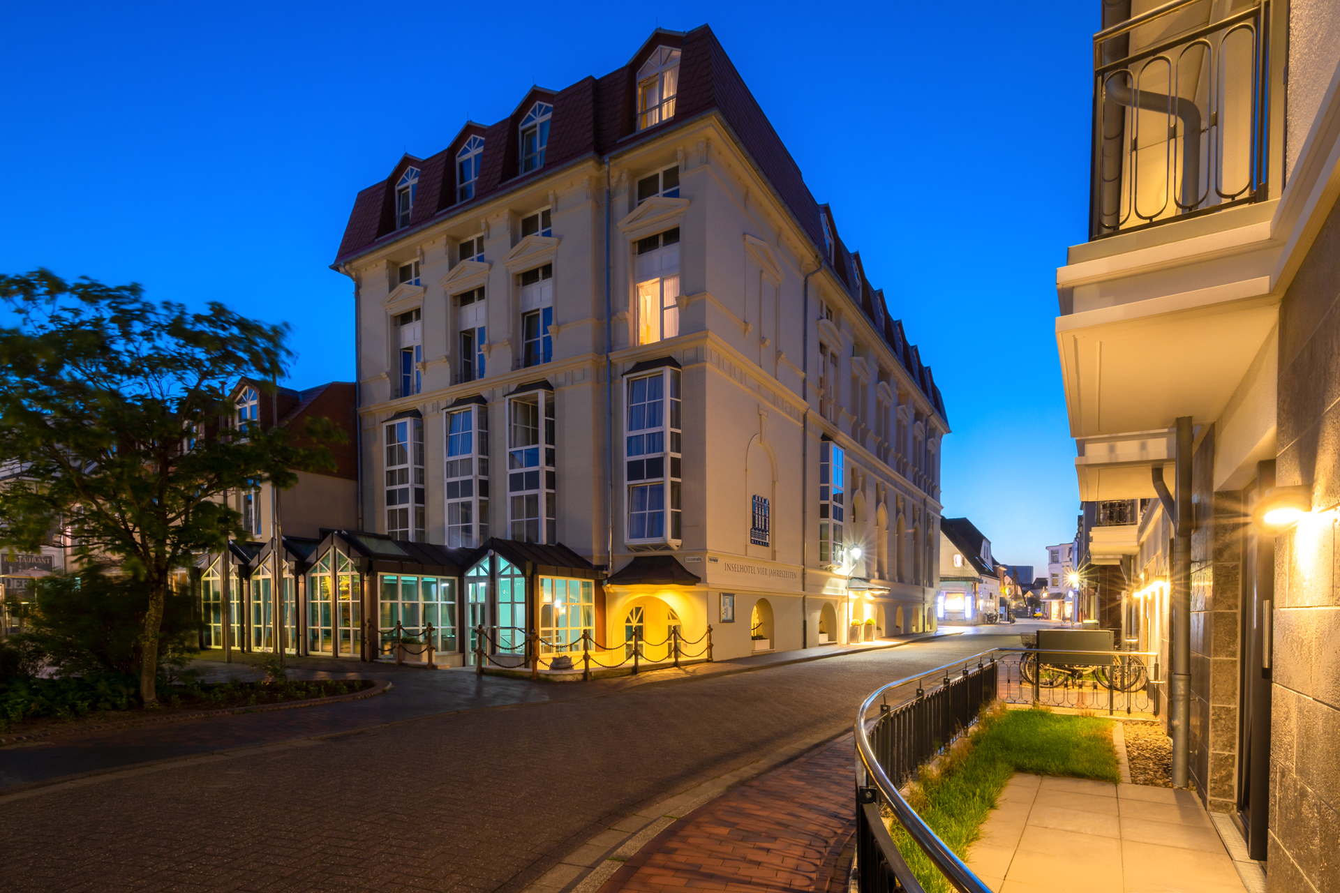 Außenansicht des Inselhotel Vier Jahreszeiten bei Nacht auf Norderney mit Füßgängerzone
