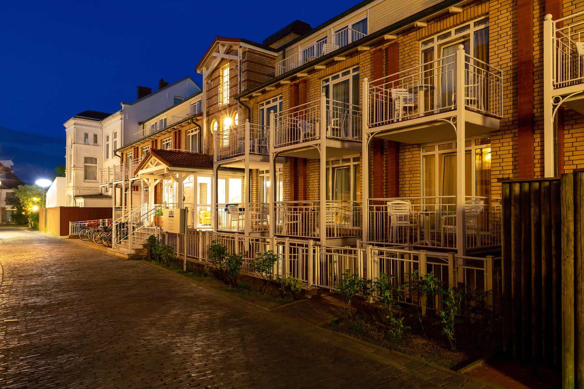 Außenansicht des Inselhotel Vier Jahreszeiten bei Nacht auf Norderney mit Füßgängerzone
